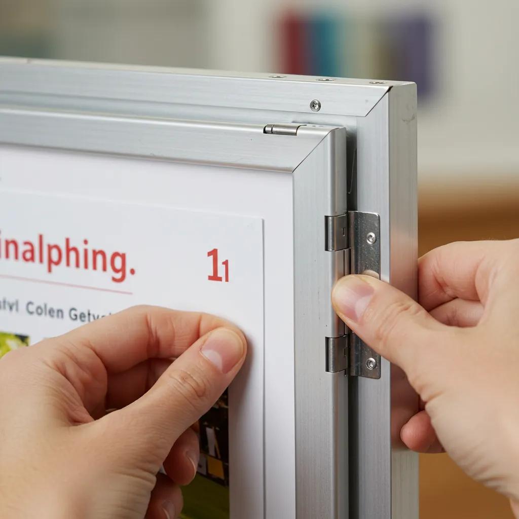 The snap-open mechanism relies on hinged aluminium profiles that pivot outward when lifted and clamp shut when pressed back into place. To change a poster you lift each side, remove the clear anti-glare cover, slide out the old print and insert the new one aligning edges, then replace the cover and snap the profiles closed. Materials commonly used in the mechanism include anodised aluminium for the frame and PVC anti-glare films for the cover, which balance durability and clarity. Small alignment tips — such as starting at one corner and smoothing the print with a soft cloth — prevent creases and ensure a flat display.