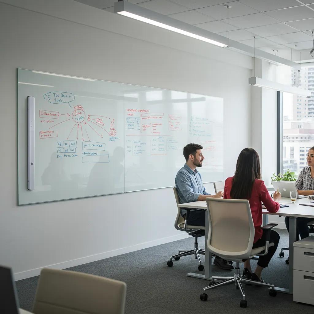 Glass whiteboards expand design options: frameless panels create clean sightlines, custom colour glassboards can match branding, and large-format or mobile glass panels support flexible layouts. These design choices elevate professional spaces and help align office interiors with corporate identity. Functionally, magnetic glass writing panels and projection-friendly surfaces increase versatility for hybrid meetings, workshops and visual presentations. Below is a short list of collaboration-focused features and a brief summary table showing how features map to use-cases.