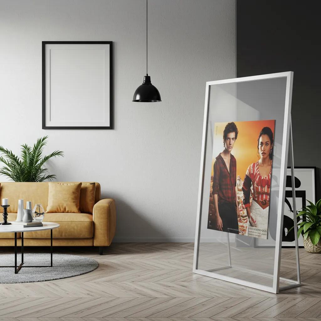 Aluminium snap frames combine corrosion-resistant metal profiles and slim mitred corners to deliver a durable, lightweight frame that complements branded interiors and shopfronts. The metal profile resists warping, provides crisp edges for a professional look and supports repeated poster changes without losing alignment. Available finishes — commonly in neutral tones such as silver or black — allow visual consistency across multiple installations, and the weight advantage simplifies shipping and mounting. For high-visibility retail displays aluminium balances form and function, giving businesses a long-lasting solution that enhances signage aesthetics.