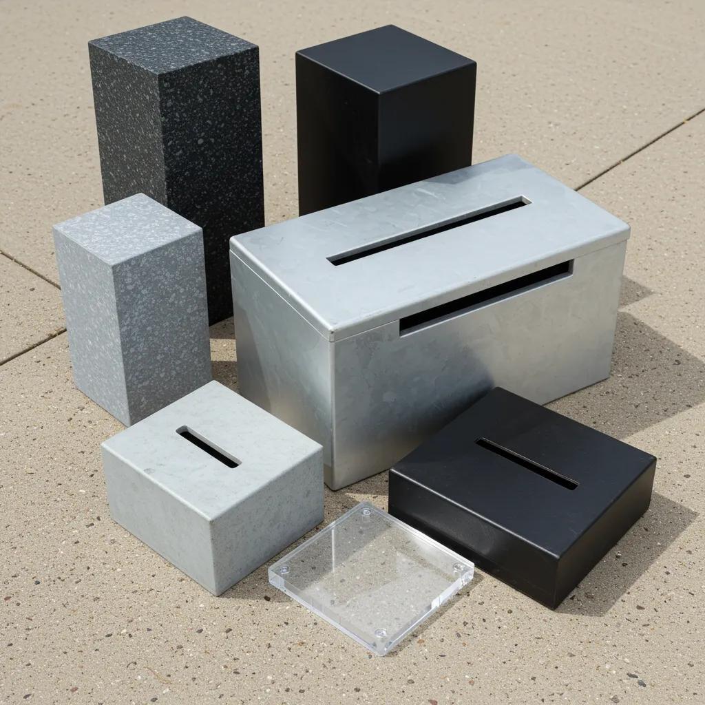 Material properties determine common outdoor failure modes such as rust, UV-fade, seal failure and thermal expansion; understanding these helps plan maintenance schedules. Protective coatings, anodising or powder-coating on metal prevent corrosion and extend lifecycle, while UV stabilisers and opaque additives improve plastic longevity; acrylic benefits from UV-resistant grades and periodic cleaning to prevent micro-scratches that trap moisture. Regular inspection of seals around collection chutes and hinged lids reduces water ingress risk, and a documented maintenance frequency—quarterly inspections with touch-up coatings where necessary—keeps boxes serviceable. Selecting materials compatible with anchoring methods and replacement parts will reduce long-term costs and downtime.